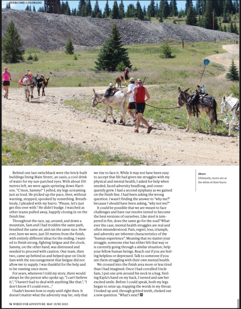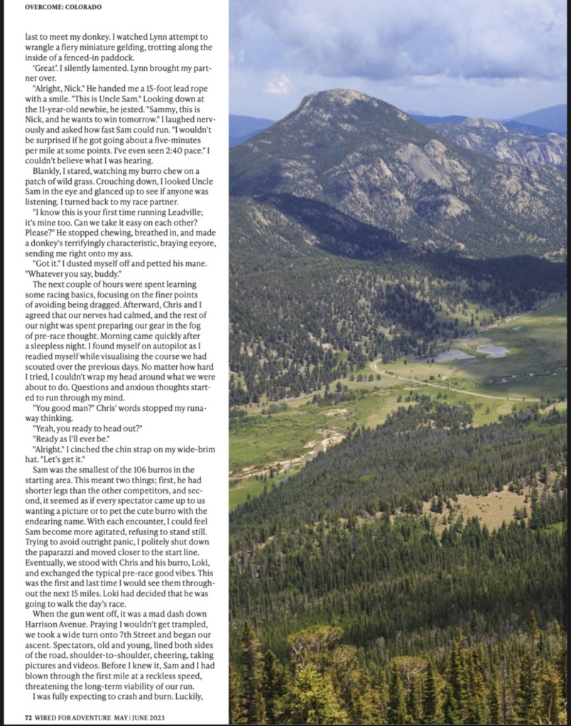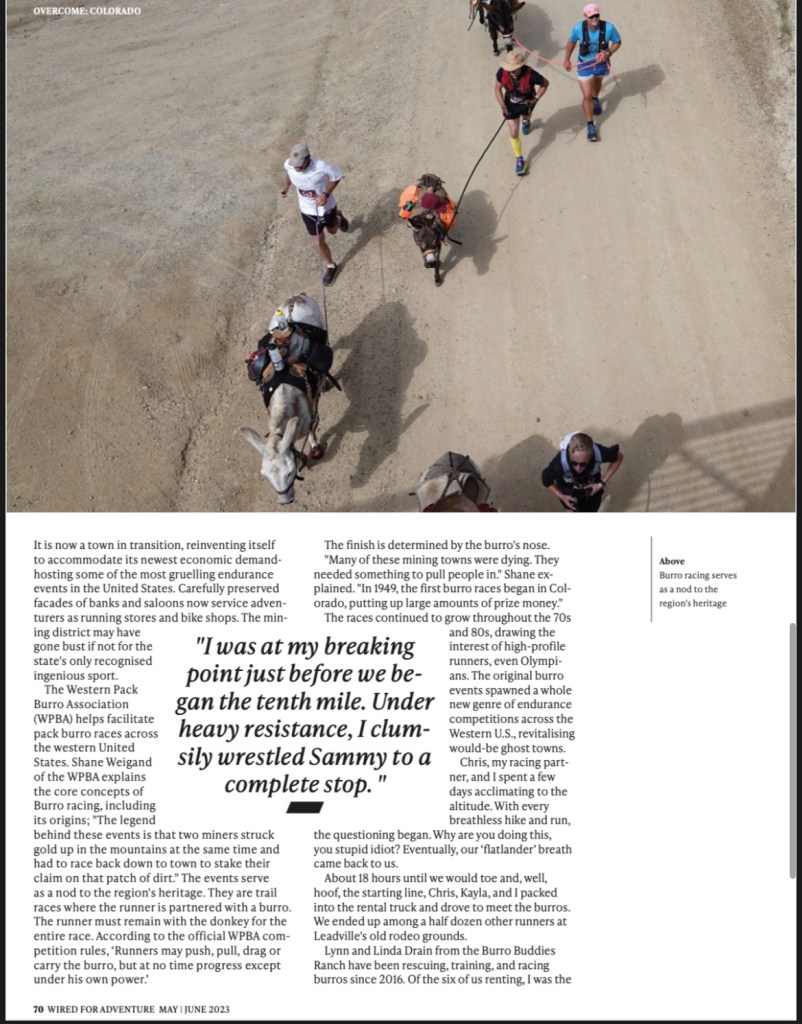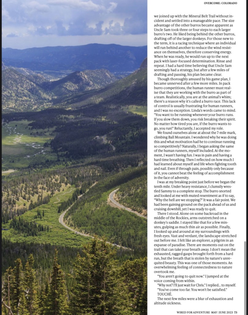 ” I was at my breaking point just before we began the tenth mile. Under heavy resistance, I clumsily wrestled Sammy to a complete stop. The burro snorted and looked at me with muted resentment as if to say, “Why the hell are we stopping?” It was a fair point. “